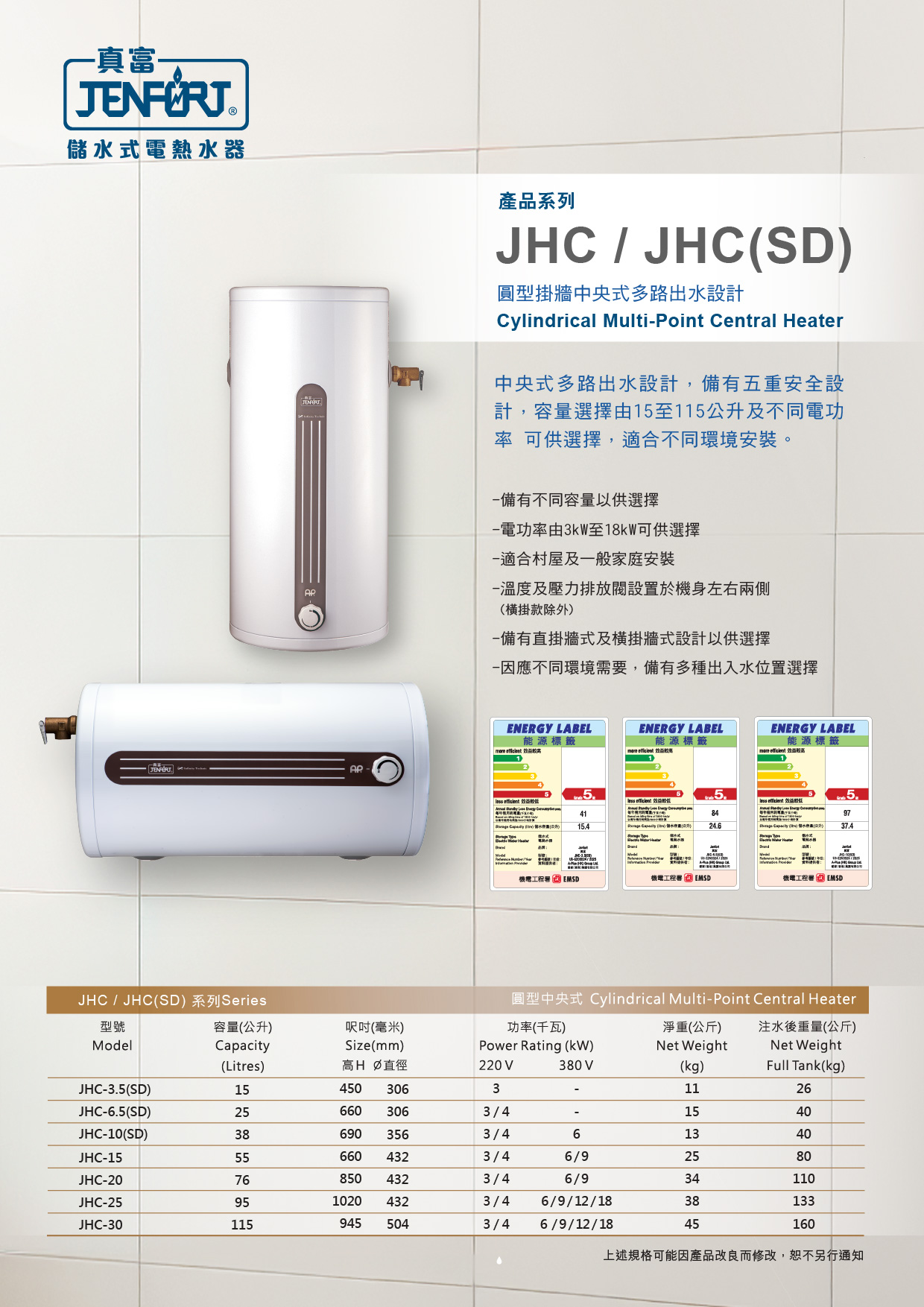 多路出水及備有5重安全設計,容量由15公升至115公升及電功率由3-9kW可供選擇,適合村屋及一般家庭安裝使用。備有直掛牆式及橫掛牆式設計以供選擇。
